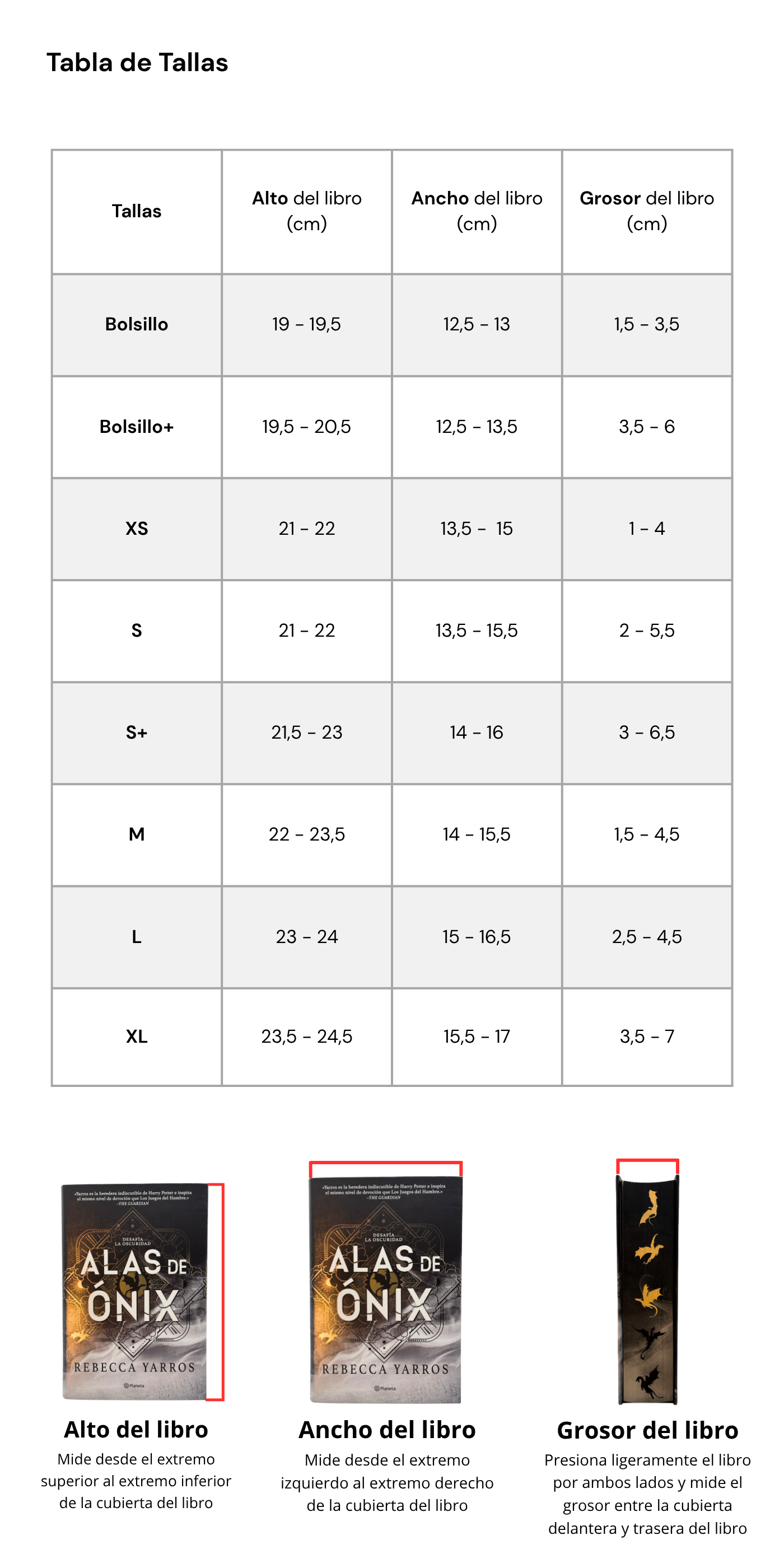 Mide el alto, ancho y grosor exterior del libro y consulta la tabla de tallas.